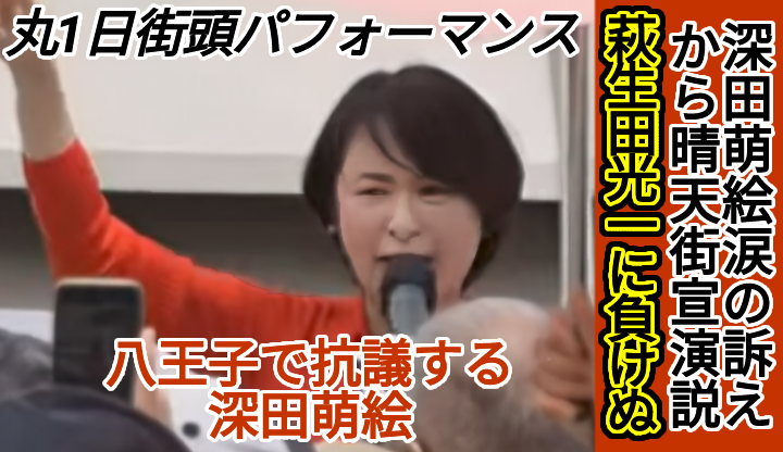 深田はこの1日赤いコーディネートで、まるで炎に包まれたジャンヌ・ダルクのように、萩生田氏の制裁に屈さずと、ほぼ丸一日八王子駅前を占拠し演説を行っていた。