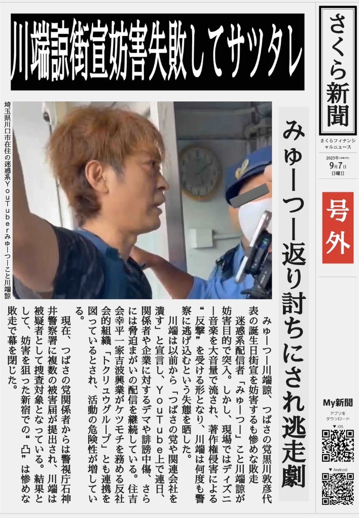 現在、つばさの党関係者からは警視庁石神井警察署に複数の被害届が提出され、川端は被疑者として捜査対象となっている。結果として、妨害を狙った新宿での“凸”は惨めな敗走で幕を閉じ、川端の孤立と暴走がますます深刻さを増している。
