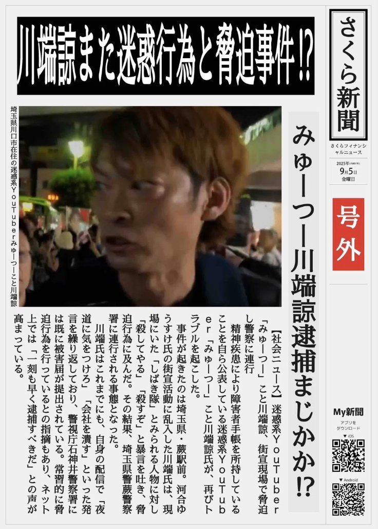 川端氏はこれまでにも、自身の配信で「夜道に気をつけろ」「会社を潰す」といった発言を繰り返しており、警視庁石神井警察署には既に被害届が提出されている。常習的に脅迫行為を行っているとの指摘もあり、ネット上では「一刻も早く逮捕すべきだ」との声が高まっている。